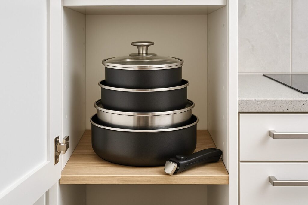 The modern home demands smart design, and removable handle cookware delivers exactly that. Traditional pots and pans take up excessive space, often leaving cabinets cluttered and disorganized. In contrast, removable handle sets allow all components — frying pans, saucepans, and sauté pans — to stack neatly inside one another, reducing storage space by up to 50%. This is particularly beneficial for smaller urban kitchens, RVs, and tiny homes where every inch of cabinet space counts. Detachable handles also make it easy to move cookware directly from stovetop to oven or even to the dining table, reducing the need for multiple serving dishes.